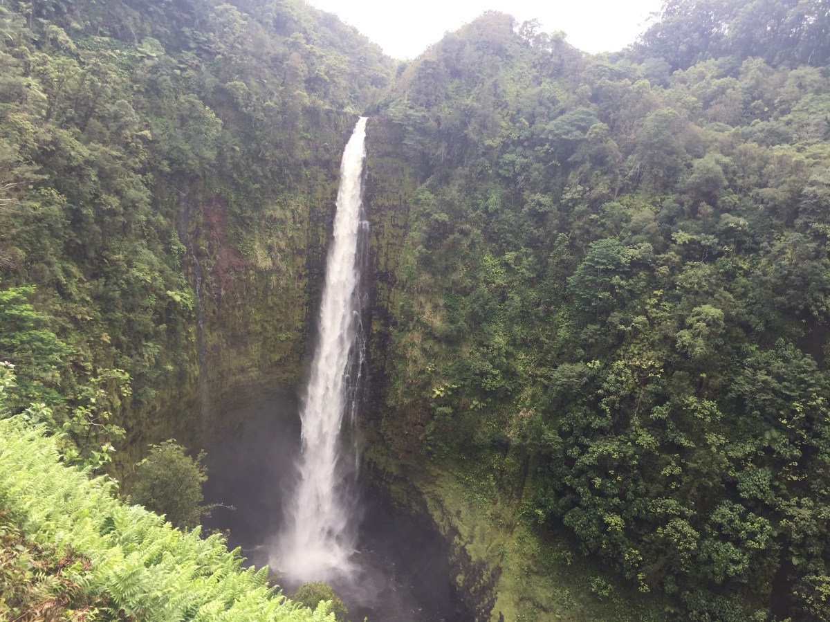Sure, there was a landslide to scurry over. But everywhere: island foliage in all its exuberance. Over a low wall of carefully assembled lava rocks: a view of the ocean. And after an eighth of a mile or so, the unmistakable sound of a waterfall. The air got cooler. We found ourselves under a leaf canopy, staring up at this: